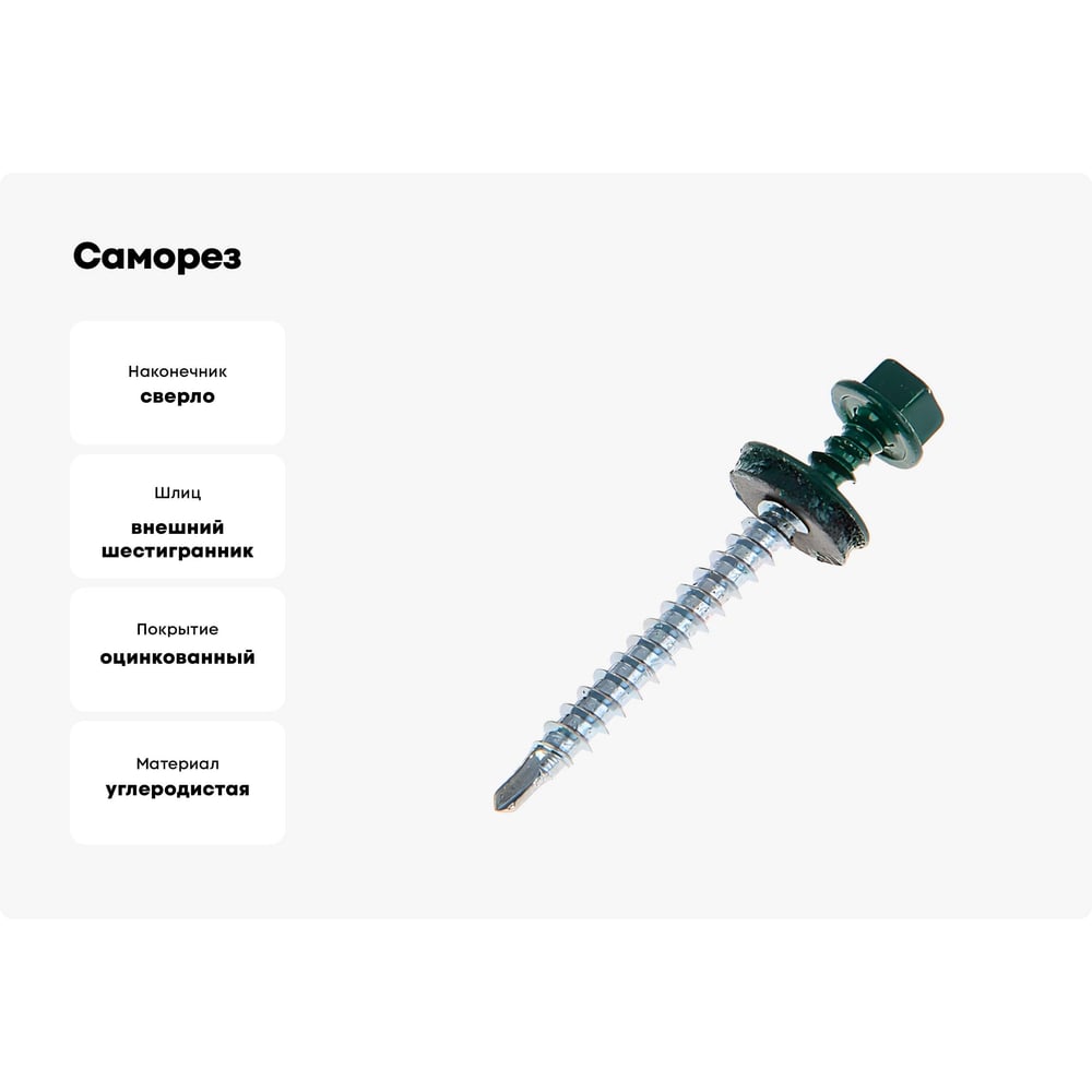 Длина 51 мм Тип фасовки кг Материал углеродистая сталь Покрытие оцинкованный Диаметр 4.8 мм Назначение для деревянных и металлических оснований ISO нет ГОСТ нет Наличие пресс-шайбы есть Нержавеющая сталь да Цвет покрытия без покрытия Форма головки шестигранная Шлиц внешний шестигранник Наконечник сверло Цвет RAL RAL 6005 (зеленый мох) Фасовка 5 кг