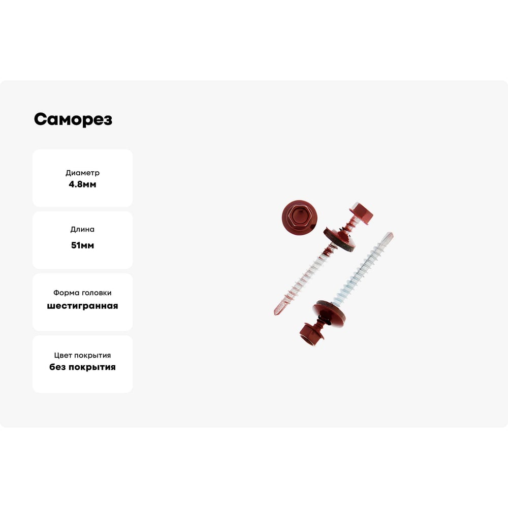 Длина 51 мм Тип фасовки кг Материал углеродистая сталь Покрытие оцинкованный Диаметр 4.8 мм Назначение для деревянных и металлических оснований ISO нет ГОСТ нет Наличие пресс-шайбы есть Нержавеющая сталь да Цвет покрытия без покрытия Форма головки шестигранная Шлиц внешний шестигранник Наконечник сверло Цвет RAL RAL 3011 (коричнево-красный) Фасовка 5 кг