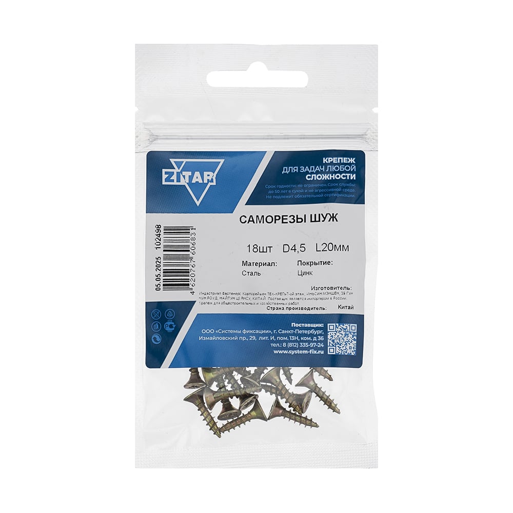 Саморез ШУж с потайной головкой 4,5x20 мм, 18 шт., пакет Zitar 102498