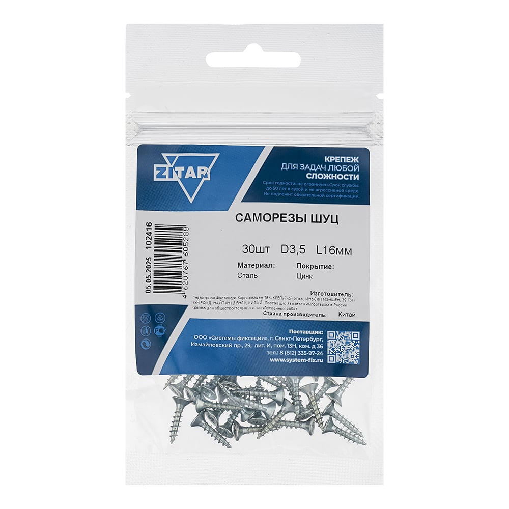 Саморез ШУц 3,5х16 потайная головка 30 шт, пакет Zitar 102416