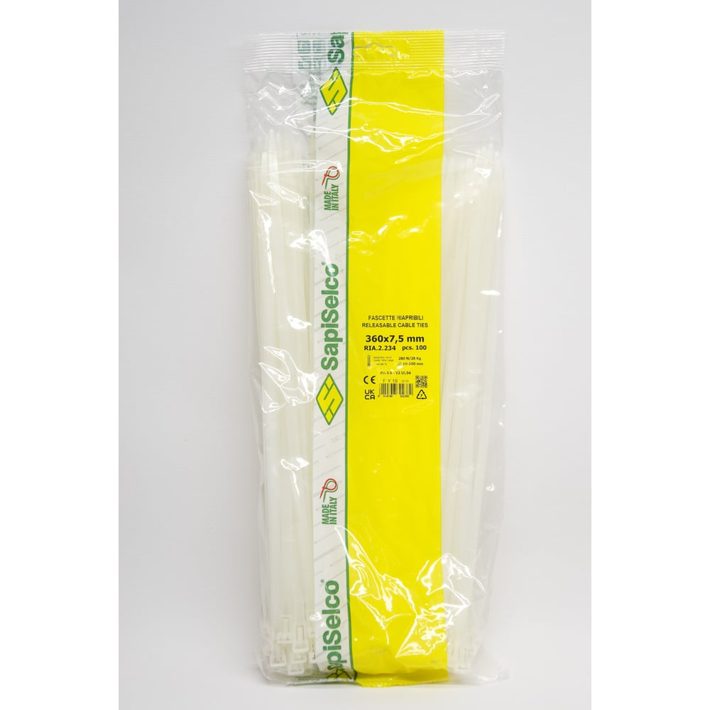 Кабельные многоразовые стяжки SapiSelco 360x7,5 мм, белые, уп. 100 шт. RIA.2.234