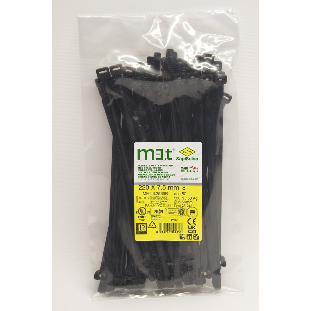 Кабельные стяжки с металлическим зубом в головке SapiSelco 220x7,5 мм, черные, уп. 50 шт. MET.3.2539R