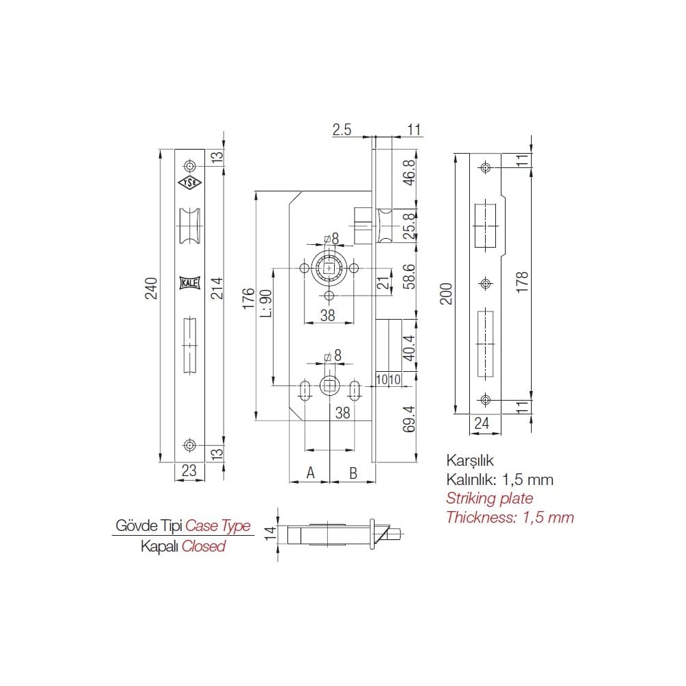 Врезной межкомнатный замок для деревянных дверей KALE KILIT 169R WC 90BS35, 23BP, SP, STB 169R3500005