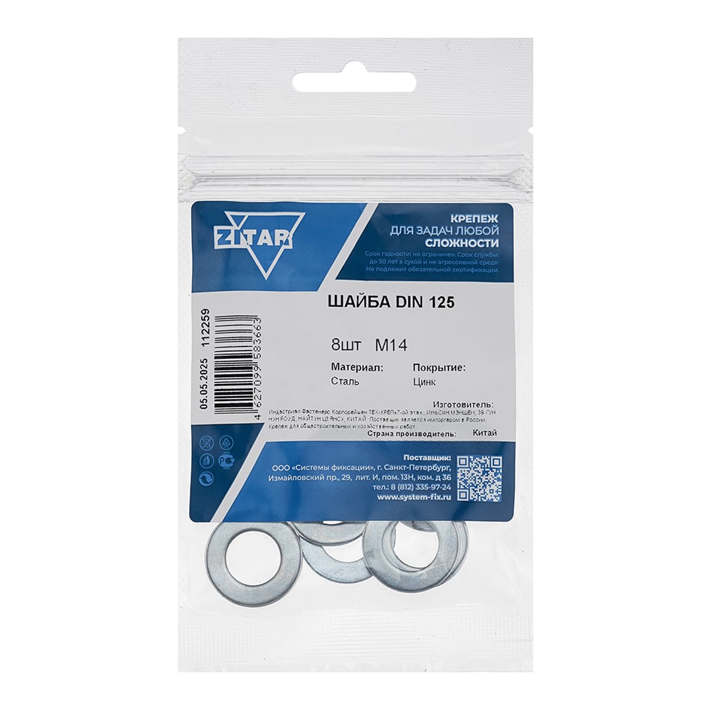 Шайба плоская DIN125a оцинкованная М14, 8 шт в пакете Zitar 112259