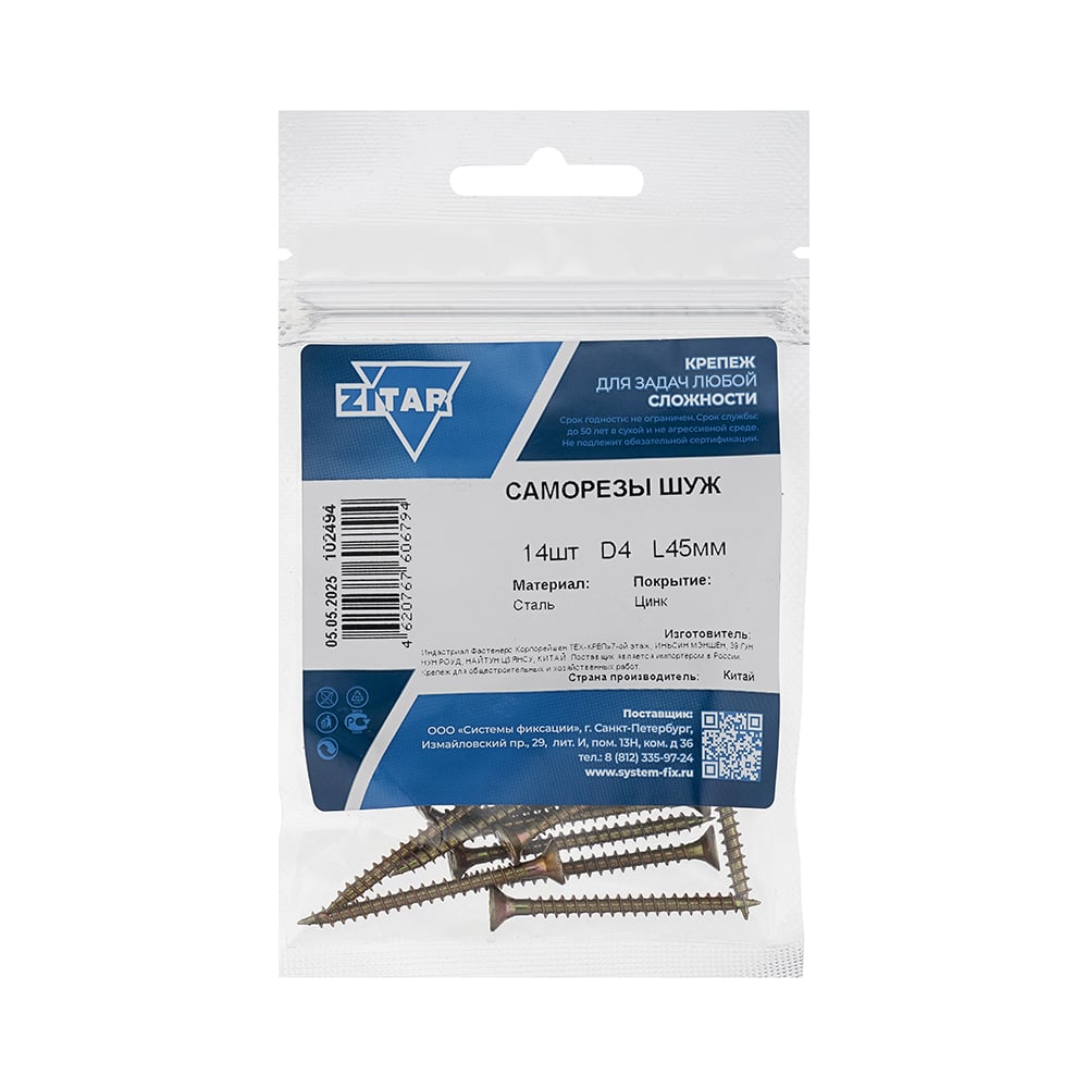 Саморез ШУж с потайной головкой 4,0x45 мм, 14 шт., пакет Zitar 102494