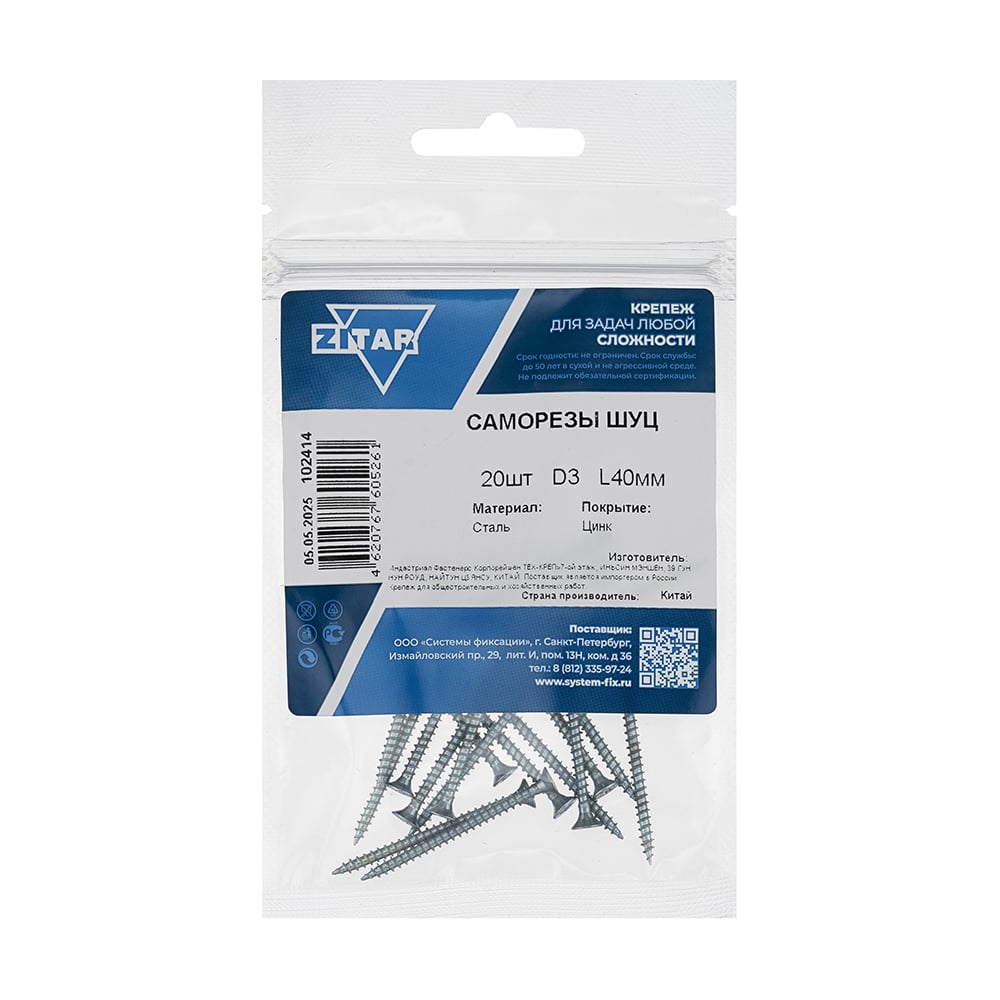 Саморез ШУц с потайной головкой 3,0x40 мм, 20 шт., пакет Zitar 102414
