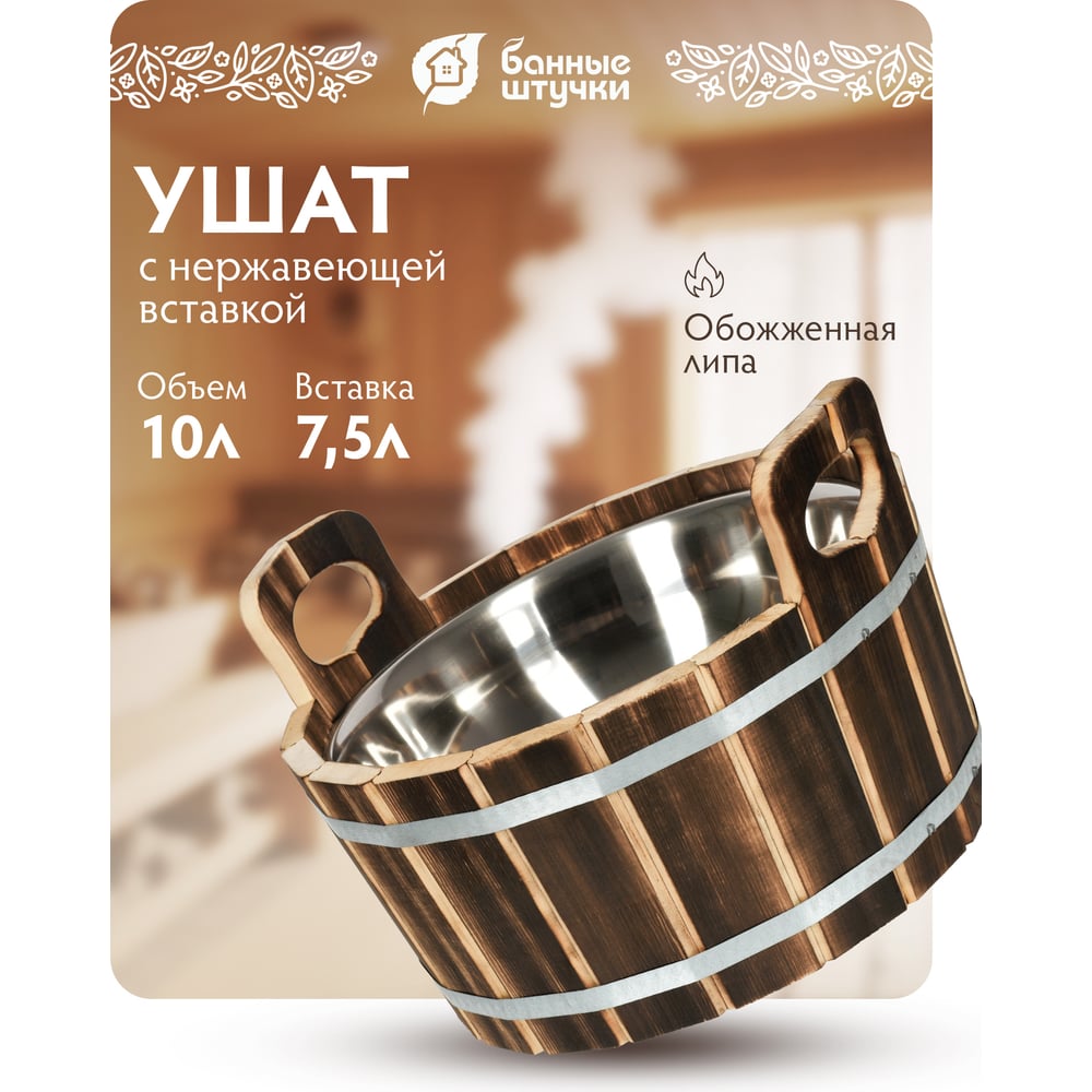Ушат "шайка" Банные штучки 10 л, с нержавеющей вставкой, обожжённая липа 33238
