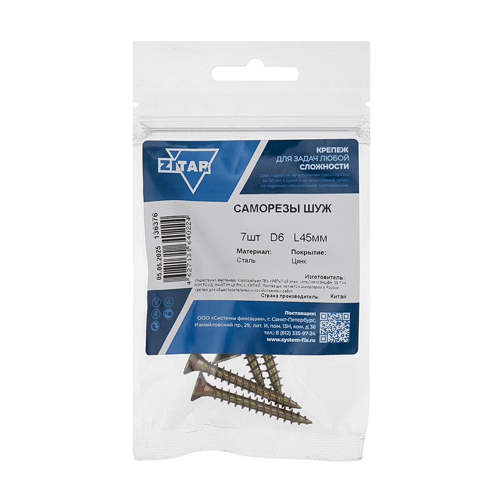 Саморез ШУж с потайной головкой 6,0x45 мм, 7 шт., пакет Zitar 136376