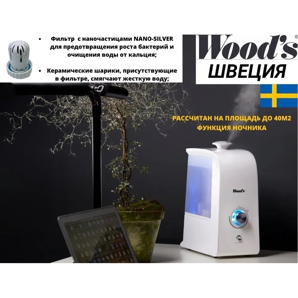 Ультразвуковой увлажнитель с антибактериальным фильтром и функцией ночника Woods Швеция WHU400