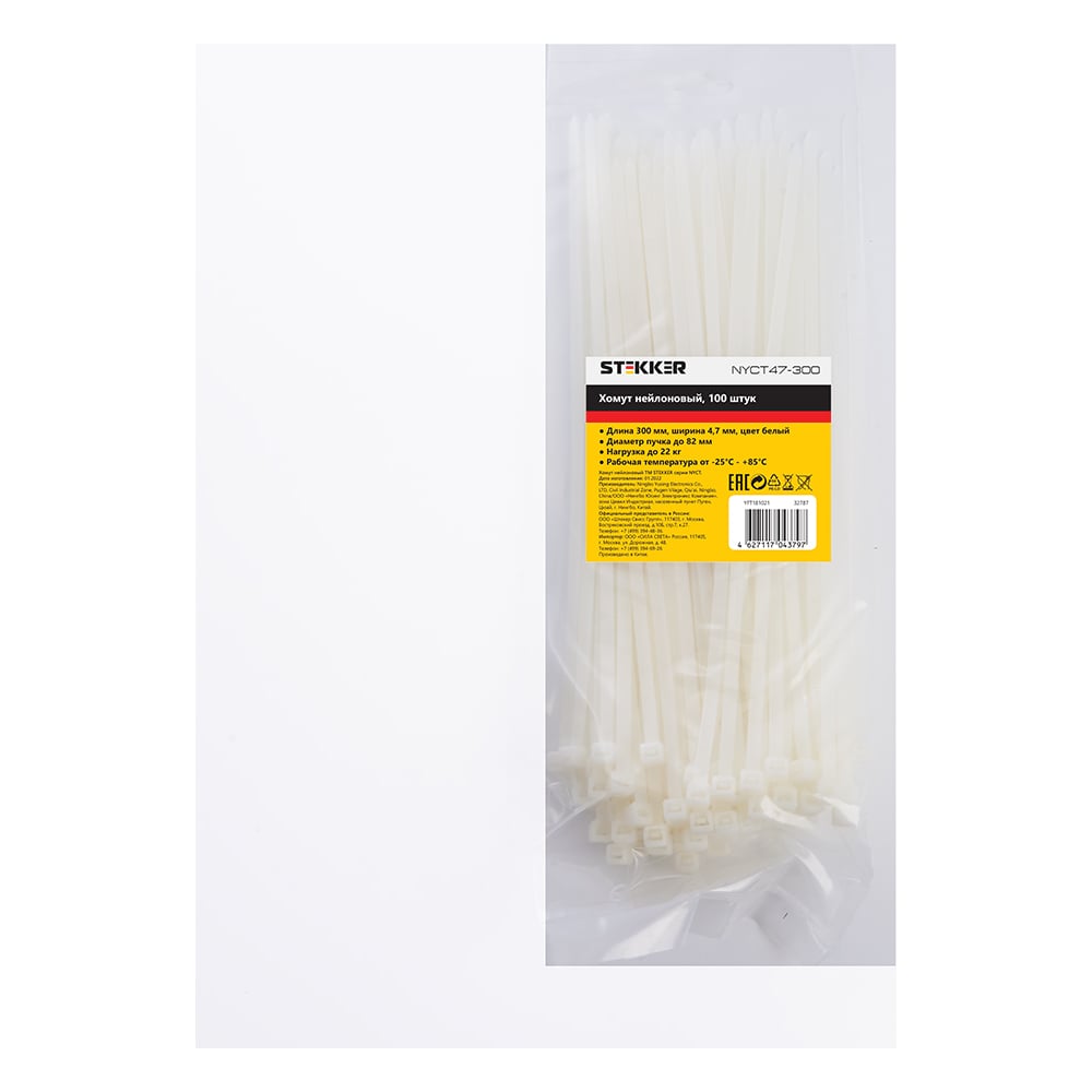 Хомут STEKKER NYCT47-300 нейлоновый 4.7x300 мм d пучка max 82 мм нагрузка 22 кг белый 32787