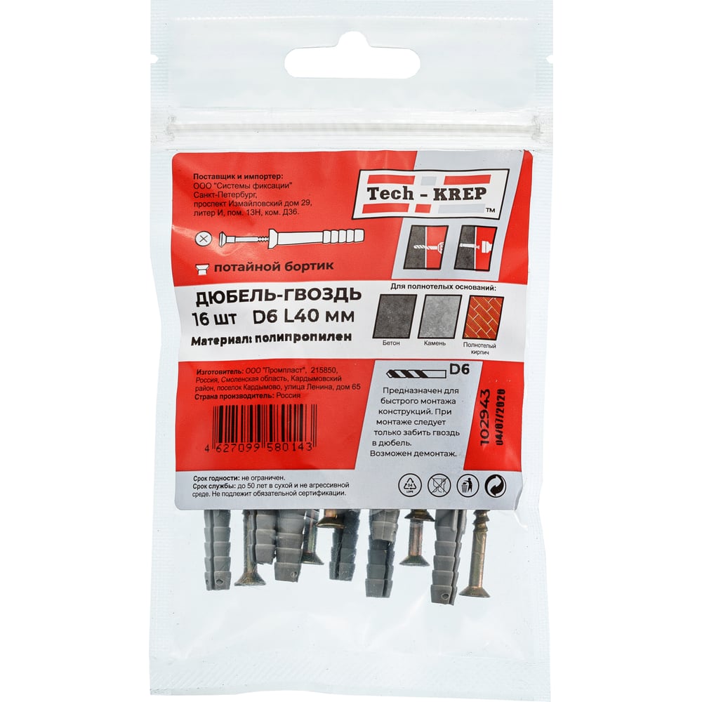 Дюбель-гвоздь Tech-Krep 6х40 потайная манжета, полипропилен 16 шт - пакет 102943