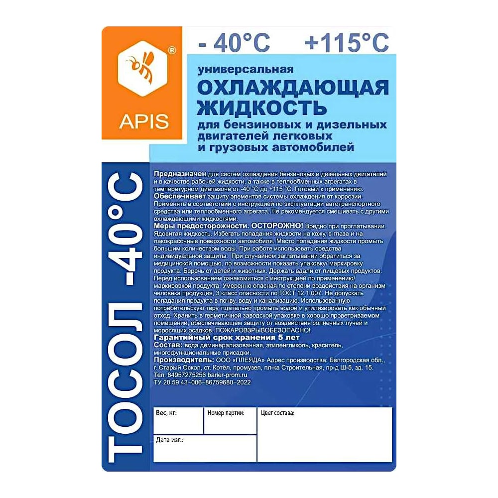 Охлаждающая жидкость для двигателя автомобиля APIS Тосол-40 10 кг RUZ-001-0008