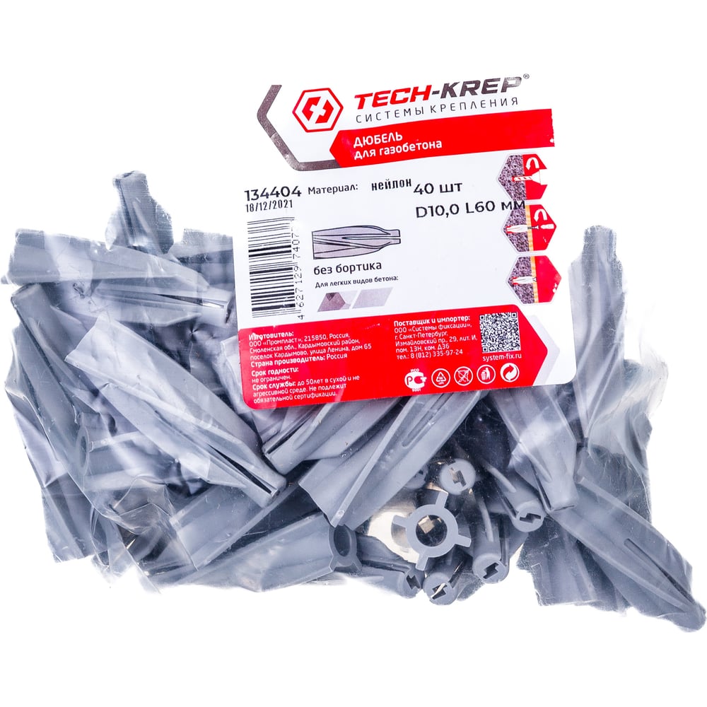 Дюбель для газобетона Tech-Krep нейлон 10х60 40 шт - пакет 134404