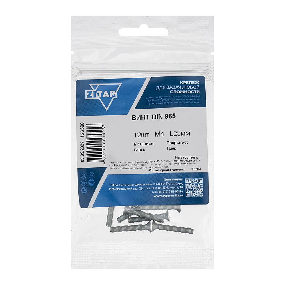 Винт DIN965 с потайной головкой оцинк. М4x25 12 шт - пакет Zitar 126588