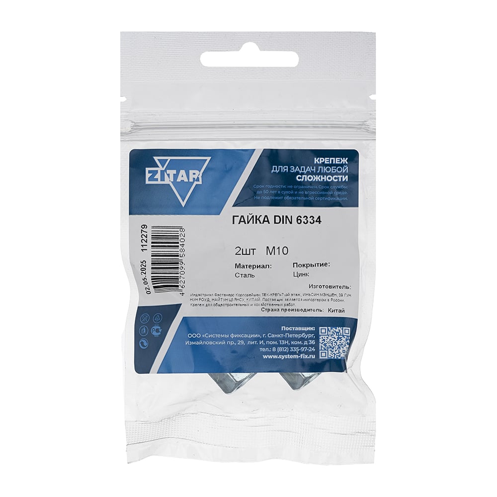 Гайка соединительная DIN6334 оцинкованная М10, 2 шт в пакете Zitar 112279