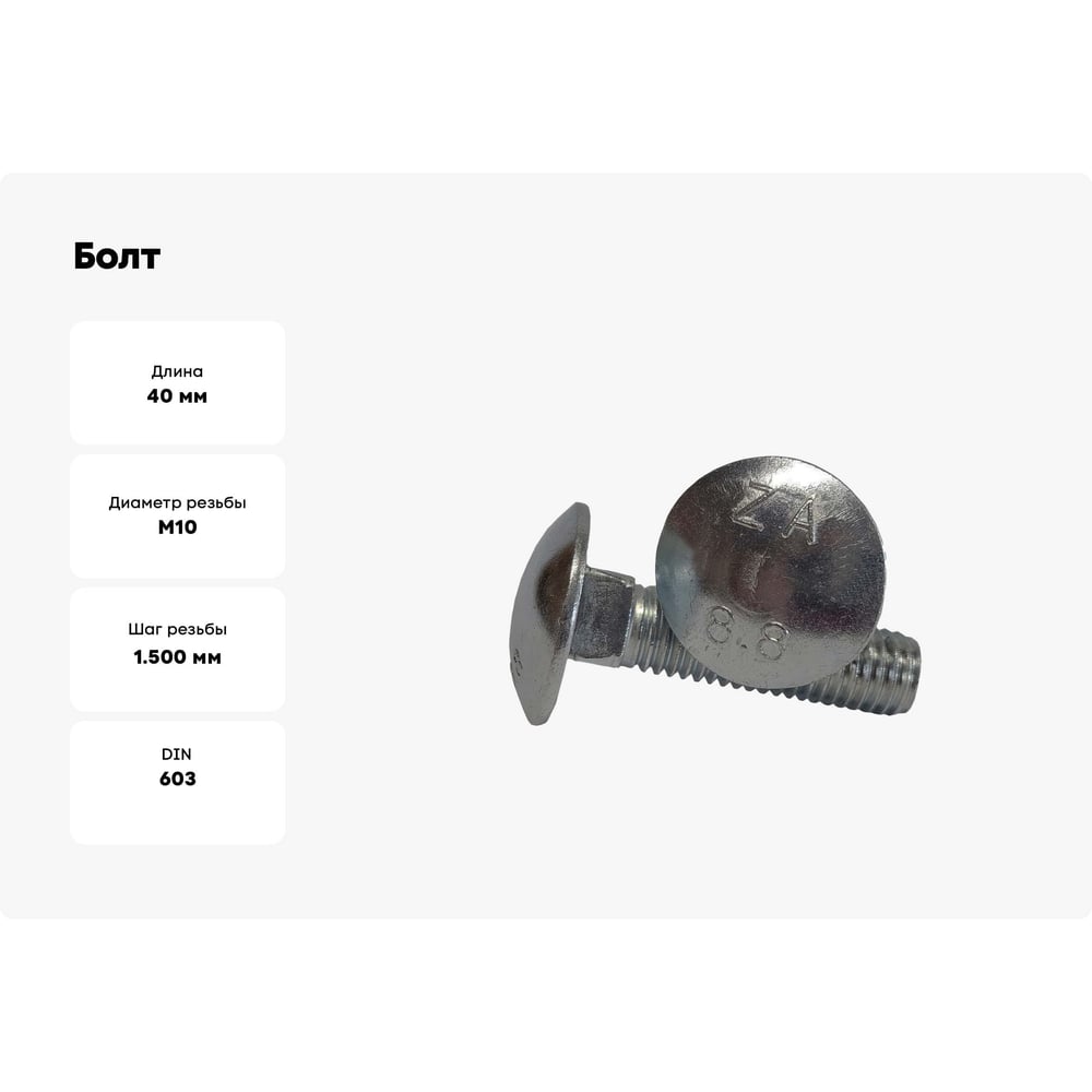Шаг резьбы 1.5 мм Длина 40 мм Комплектация болт Вид головки полукруглая Тип резьбы неполная DIN 603 Тип фасовки шт. Класс прочности 8.8 Диаметр резьбы М10 Направление резьбы правая Материал оцинкованная сталь Покрытие цинк ISO 8677 ГОСТ 7802-81 Фасовка 150 шт