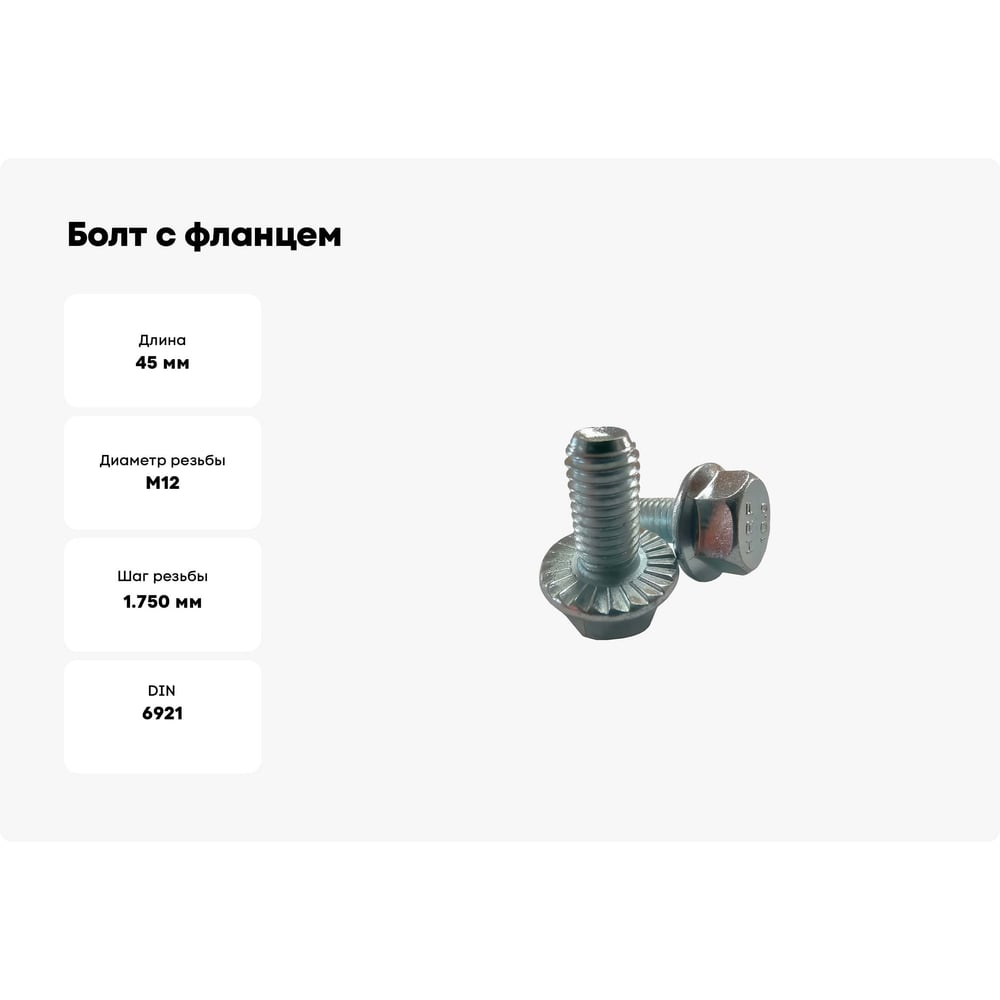 Шаг резьбы 1.75 мм Длина 45 мм Комплектация болт Вид головки шестигранная с фланцем DIN 6921 Размер под ключ 16 Тип фасовки шт. Класс прочности 10.9 Диаметр резьбы М12 Направление резьбы правая Материал сталь Покрытие цинк ISO нет ГОСТ нет Фасовка 70 шт