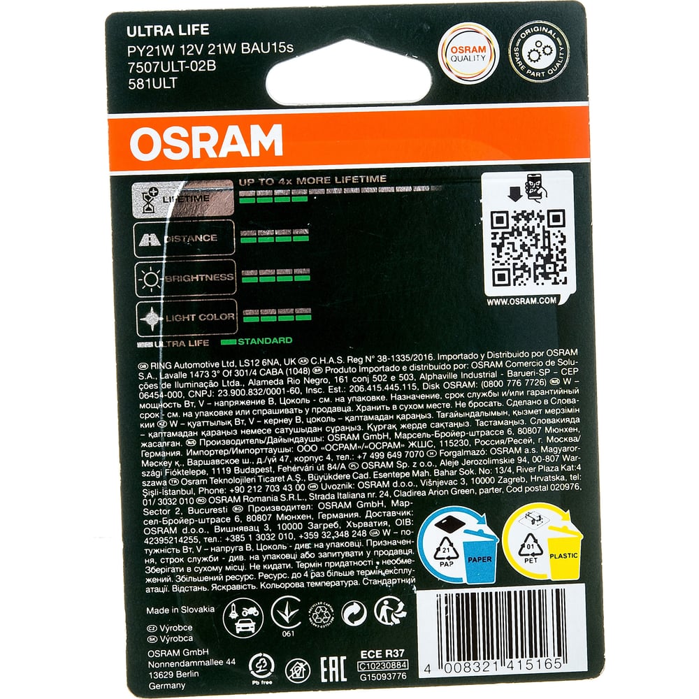 Автолампа PY21W BAU15s YELLOW ULTRA LIFE 12В 2 штуки 1.10.50 7507ULT-02B 7507ULT-2BL Osram 775785