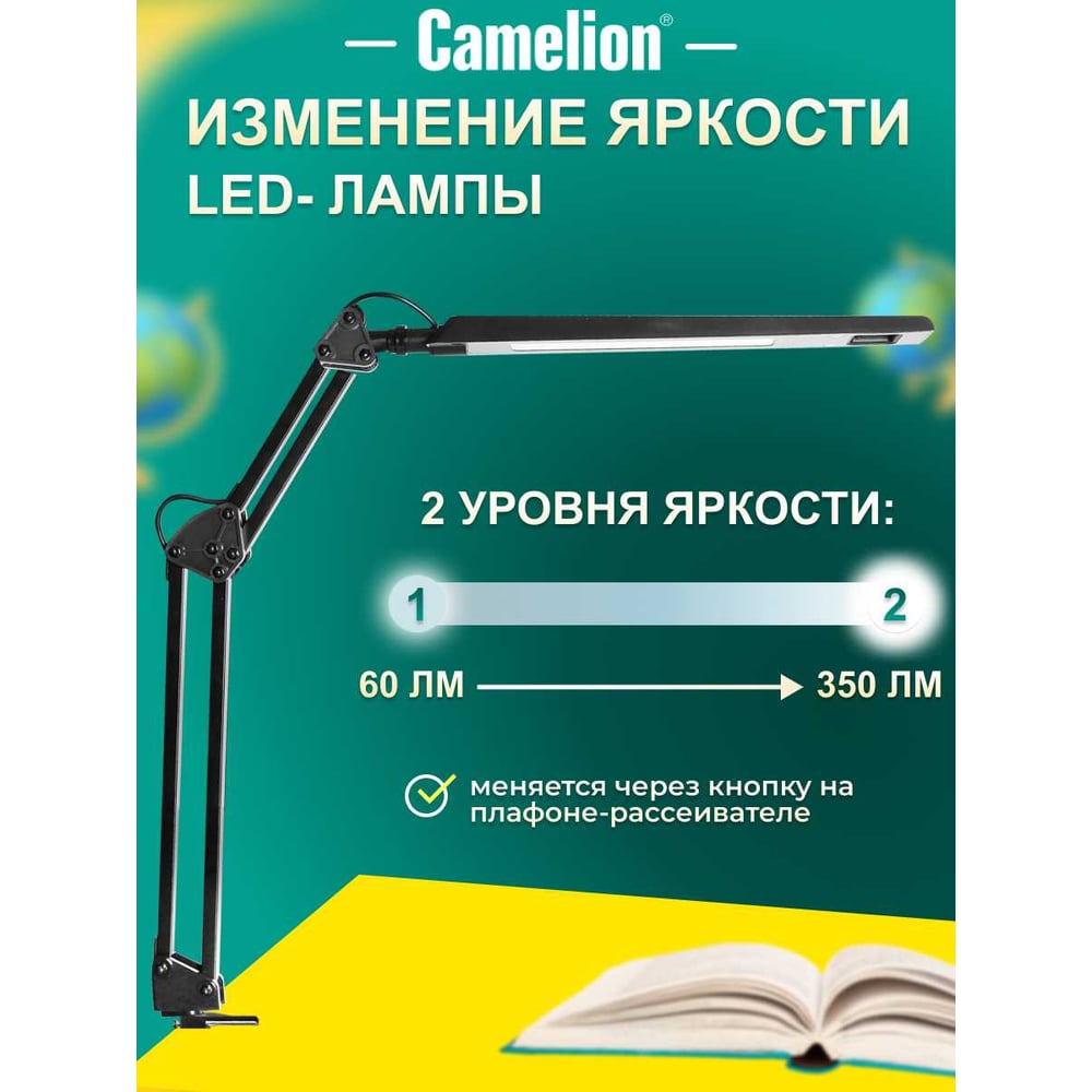 Настольный светильник Camelion KD-821 C02 черный LED 8Вт, 230В, 2 уровня яркости, 350Лм, струбцина 13527