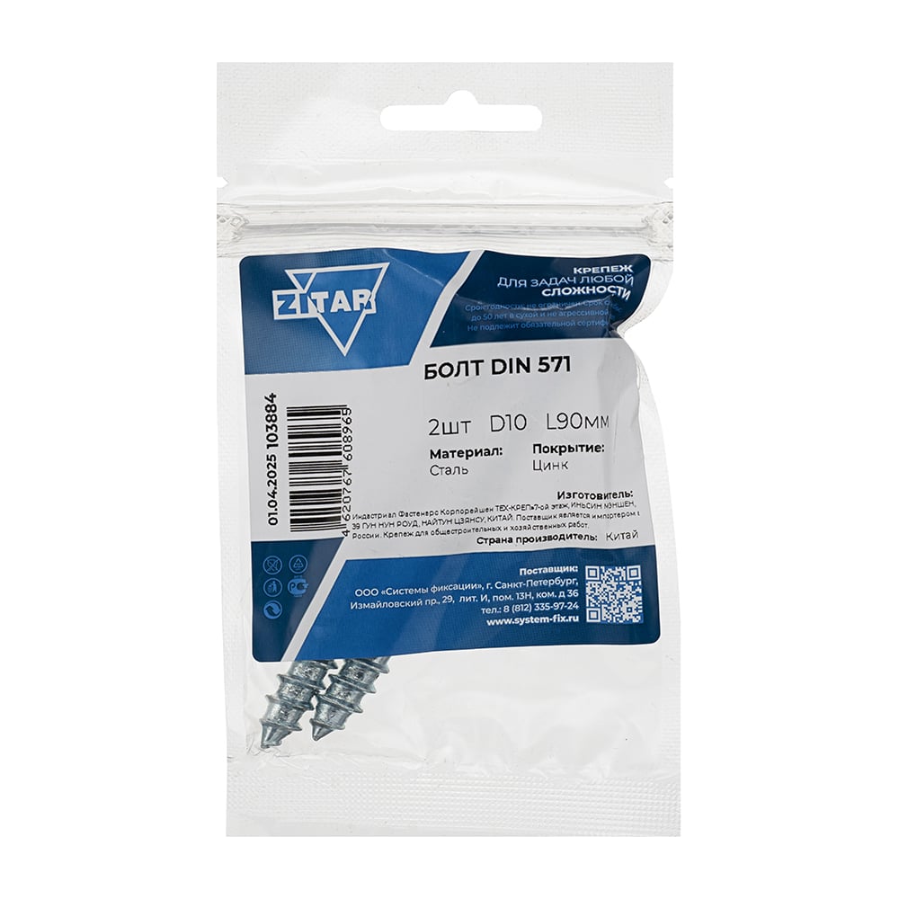 Болт DIN 571 сантехнический оцинкованный 10x90, 2 шт, пакет Zitar 103884