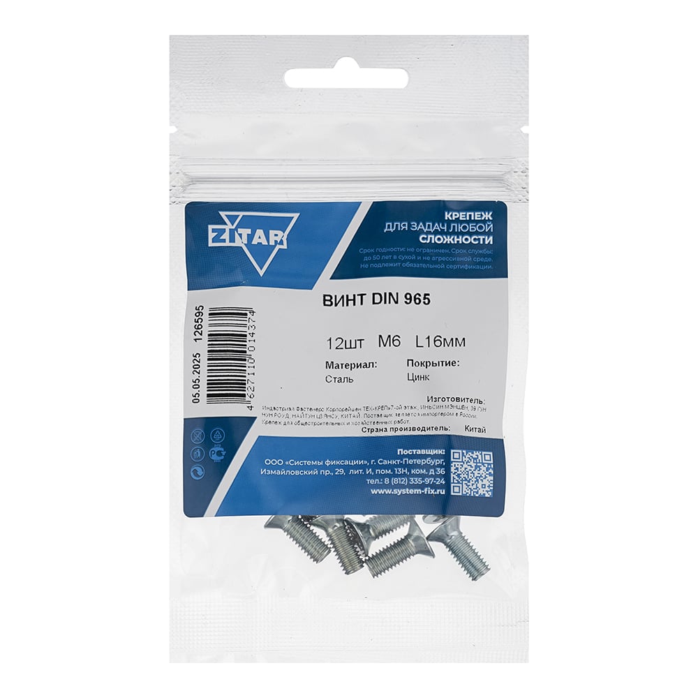 Винт DIN965 с потайной головкой оцинк. М6x16 12 шт - пакет Zitar 126595