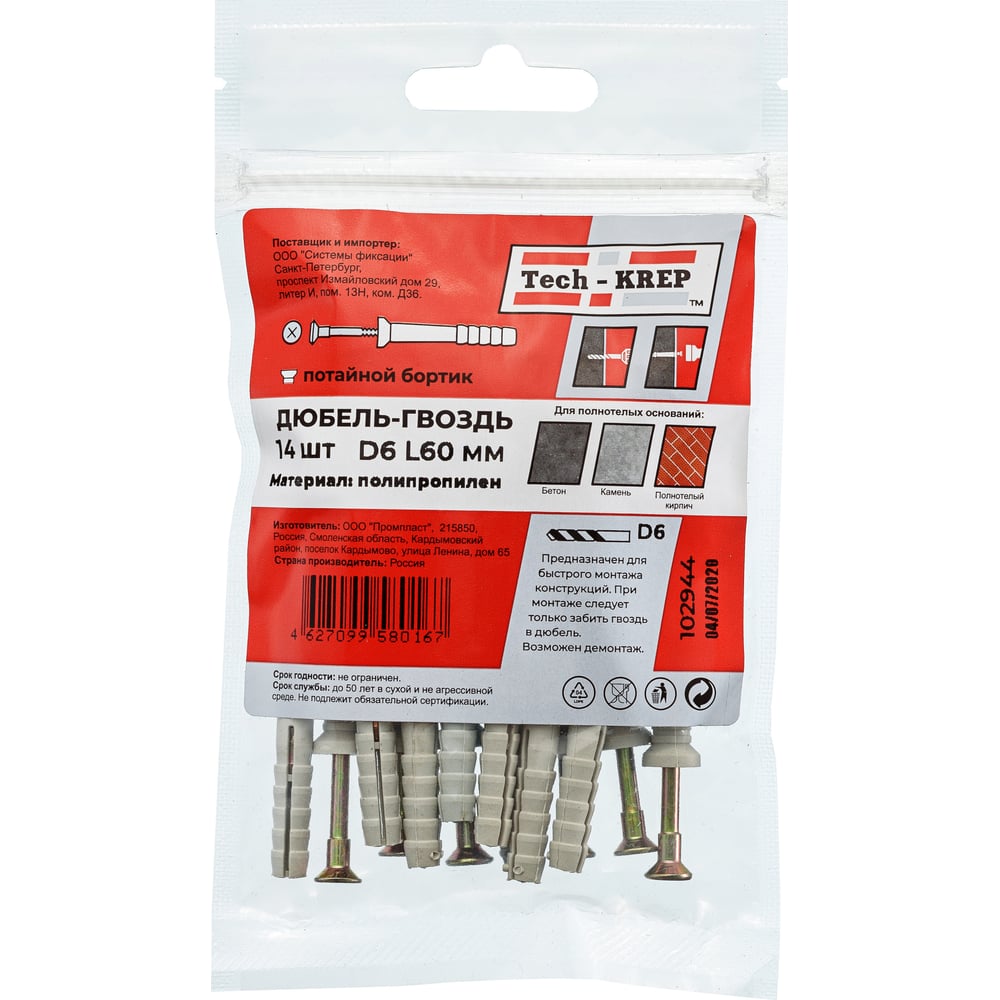 Дюбель-гвоздь Tech-Krep 6х60 потайная манжета, полипропилен 14 шт - пакет 102944
