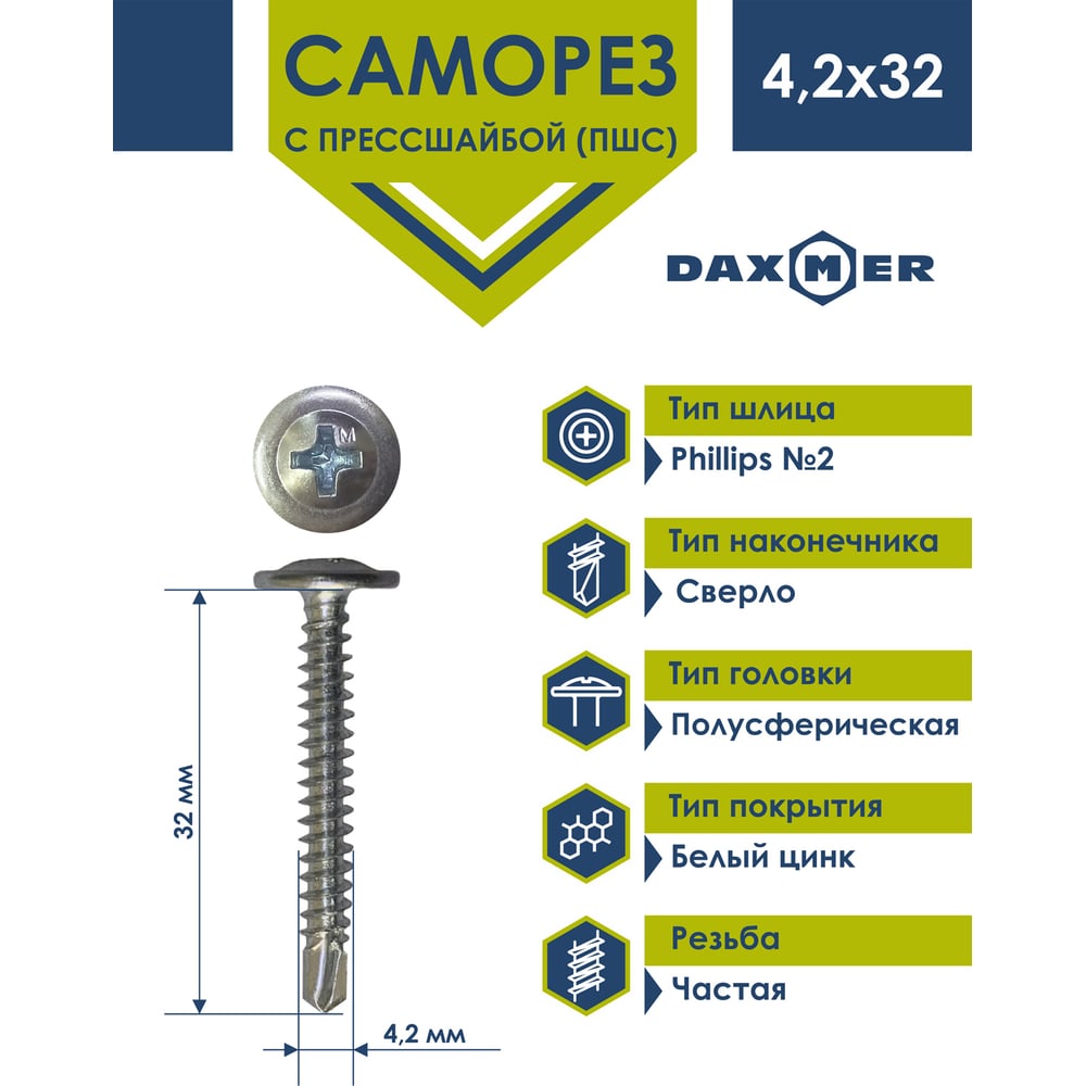 Саморез с прессшайбой Daxmer ПШС 4,2x32 цинк, усиленный, сверло, 250 шт 00-00468494