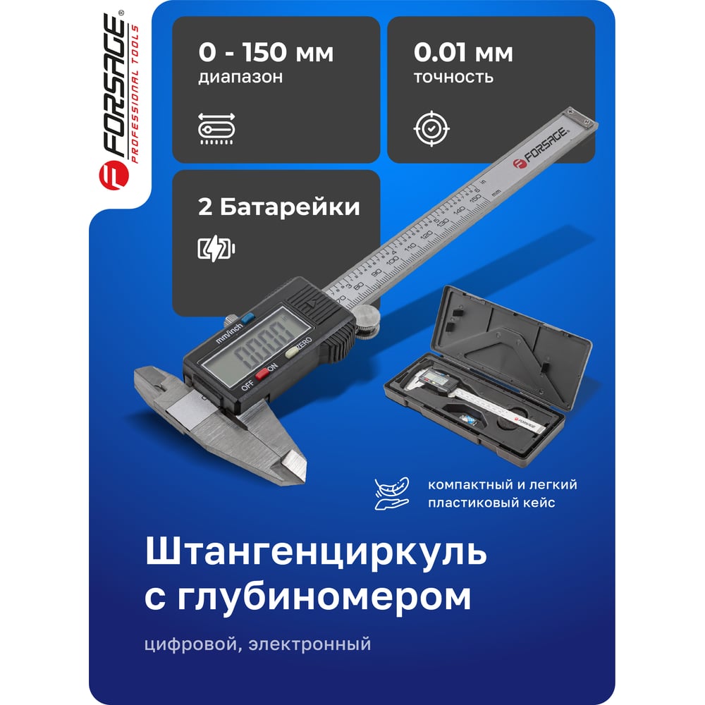 Электронный штангенциркуль Forsage 0-150 мм, 0,01 мм; внутр, Ø, наруж, Ø + глубиномер, в пластиковом футляре F-5096PE1(18060)