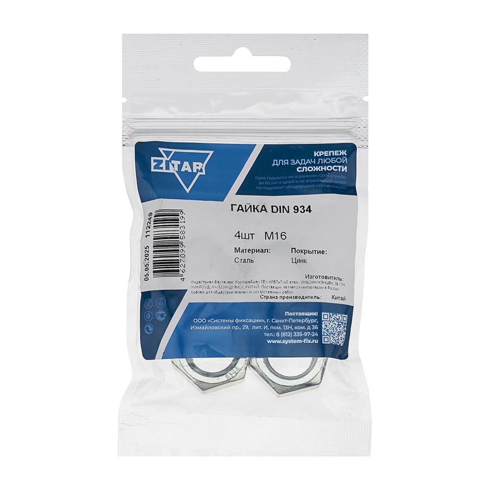 Гайка шестигранная DIN934 оцинкованная М16, 4 шт в пакете Zitar 112249