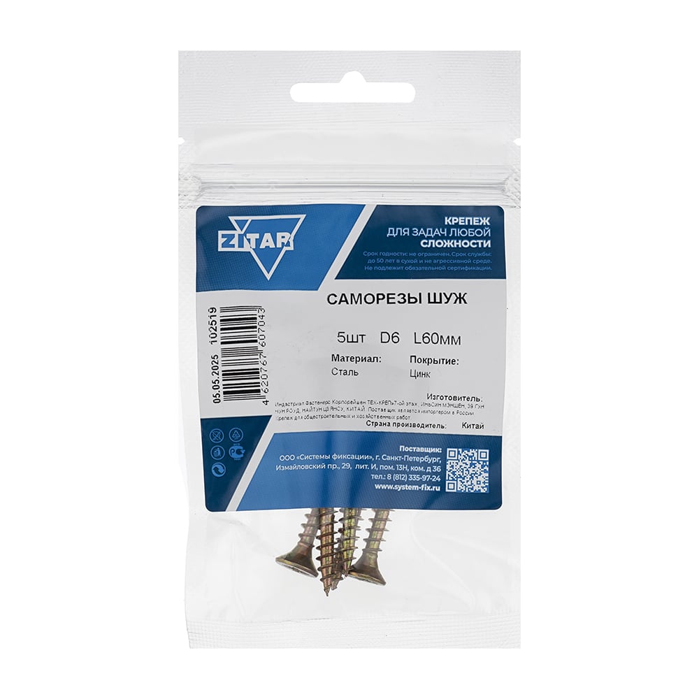 Саморез ШУж с потайной головкой 6,0x60 мм, 5 шт в пакете Zitar 102519
