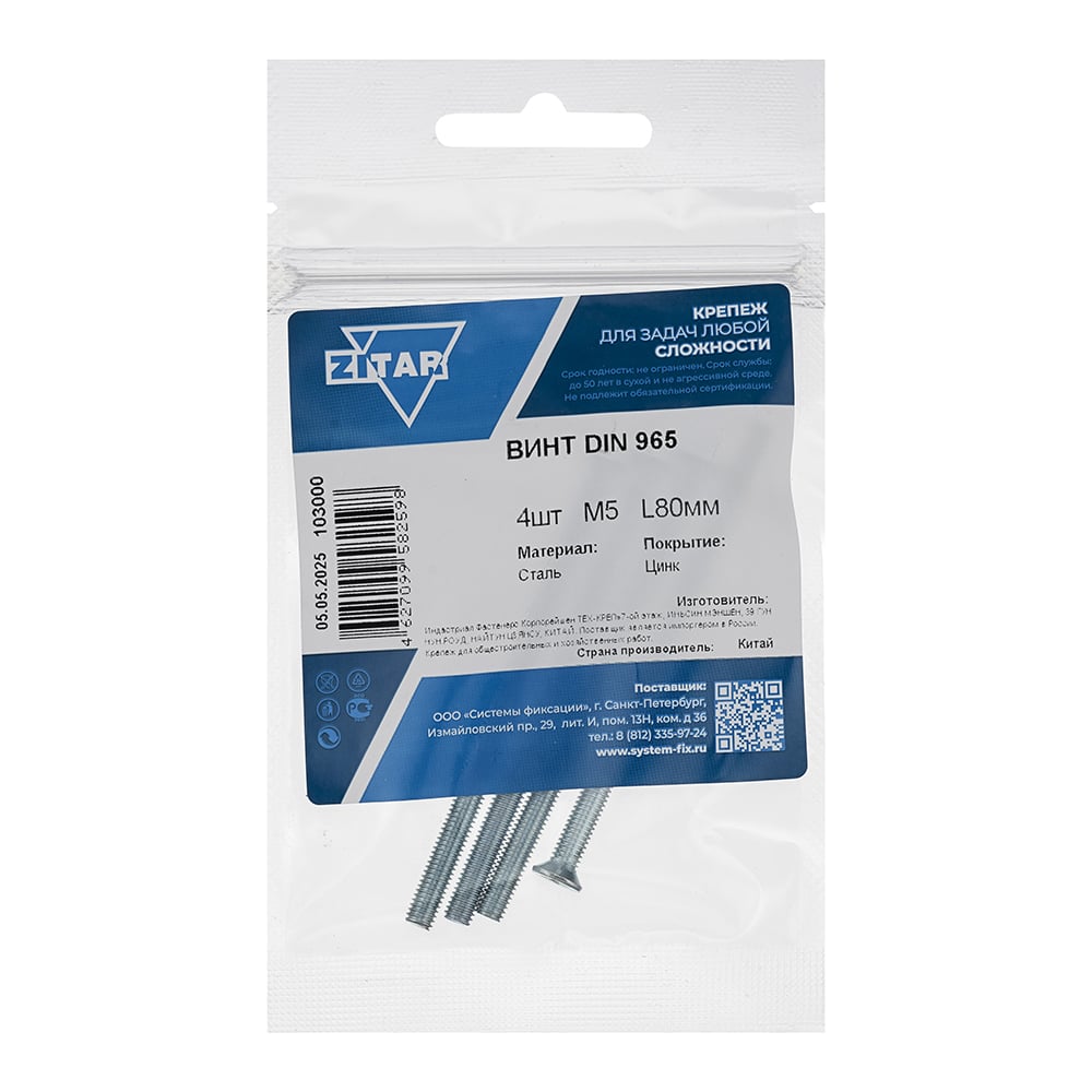 Винт DIN965 с потайной головкой оцинкованный М5x80 4 шт Zitar 103000