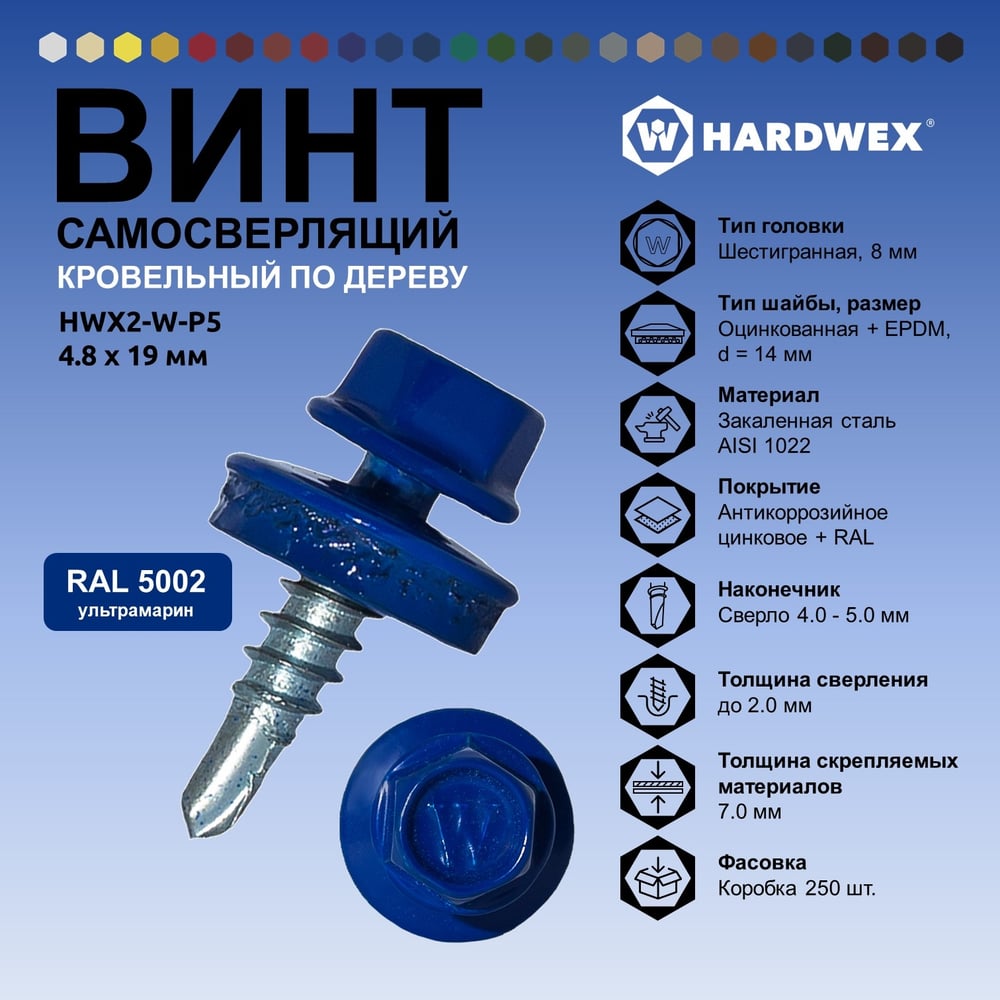 Саморез кровельный по дереву HARDWEX ТМ HWX2-W-P5-4.8x19 мм, св.№1, RAL 5002, 250 шт. 5190000000867