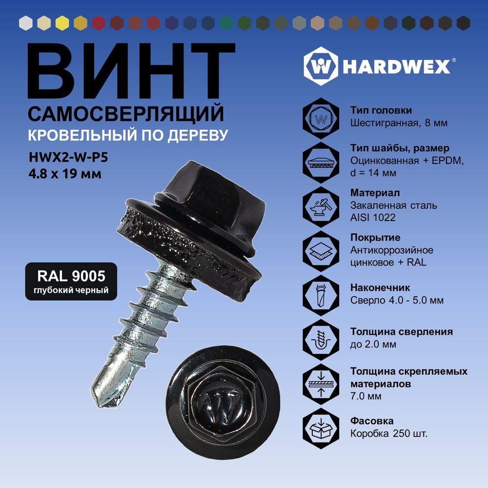 Саморез кровельный по дереву HARDWEX ТМ HWX2-W-P5-4.8x19 мм, св.№1, RAL 9005, 250 шт. 5190000001000