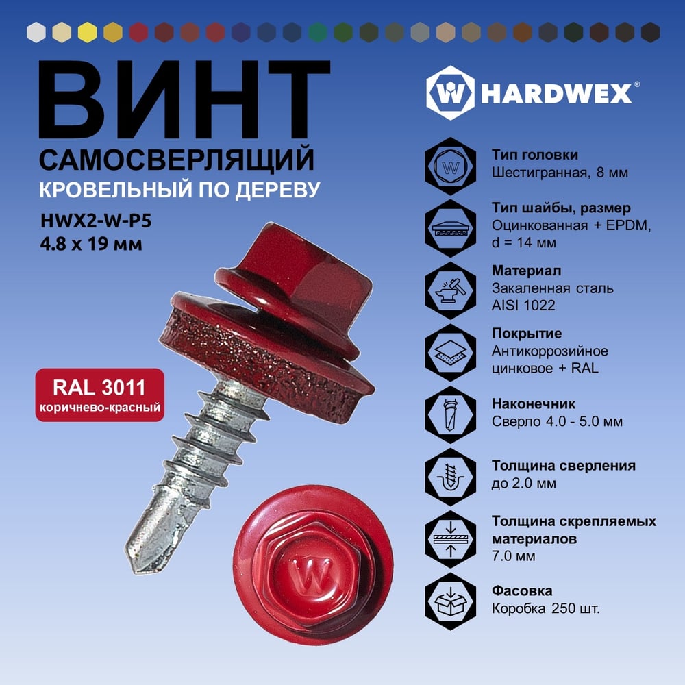 Саморез кровельный по дереву HARDWEX ТМ HWX2-W-P5-4.8x19 мм, св.№1, RAL 3011, 250 шт. 5190000000843