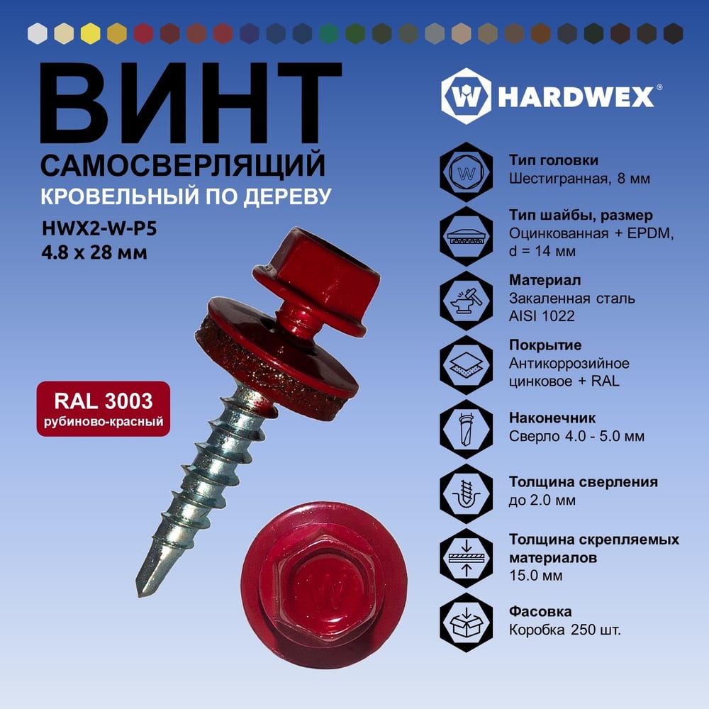 Саморез кровельный по дереву HARDWEX ТМ HWX2-W-P5-4.8x28 мм, св.№1, RAL 3003, 250 шт. 5190000001703