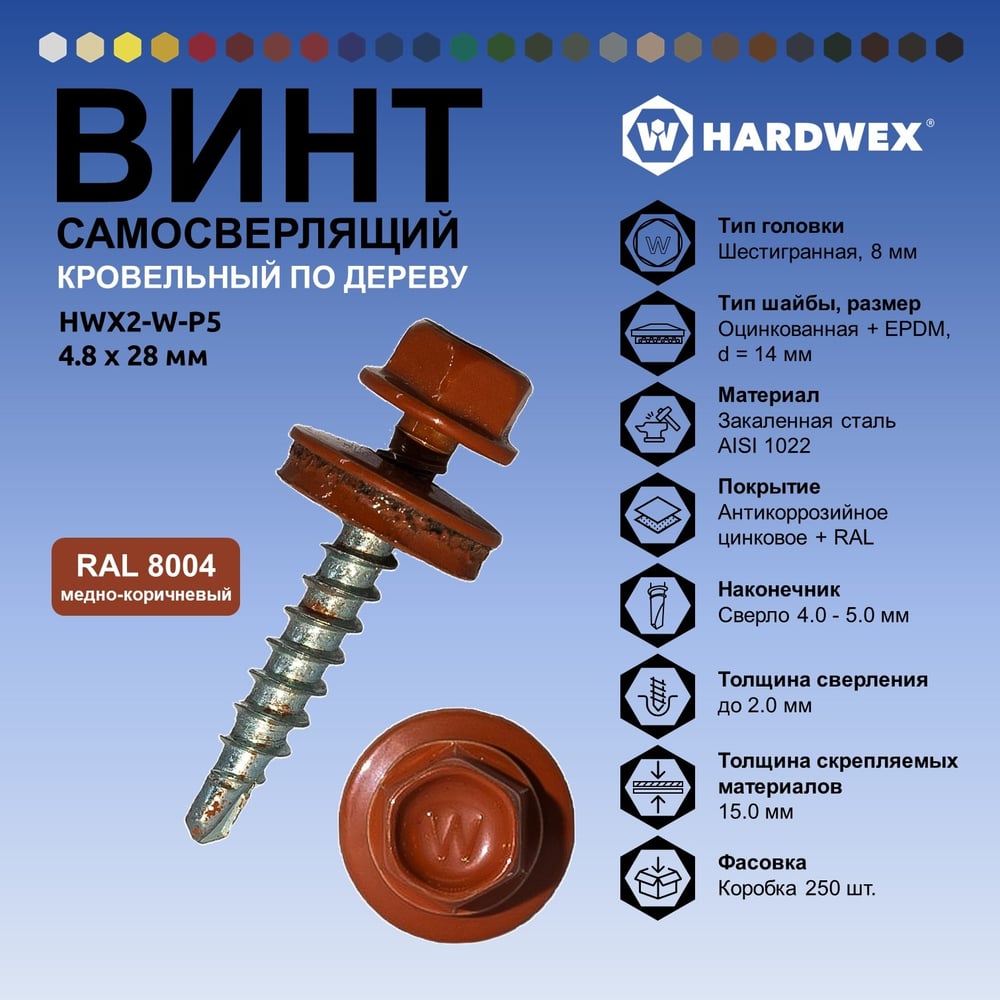 Саморез кровельный по дереву HARDWEX ТМ HWX2-W-P5-4.8x28 мм, св.№1, RAL 8004, 250 шт. 5190000001864