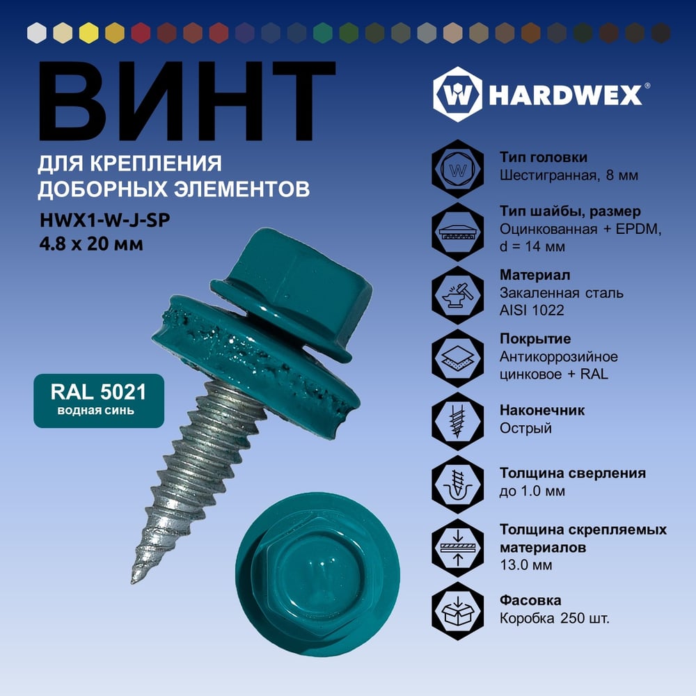 Саморез для доборных элементов HARDWEX ТМ HWX1-W-J-SP-4.8x20 мм, RAL 5021, 250 шт. 5190000001208