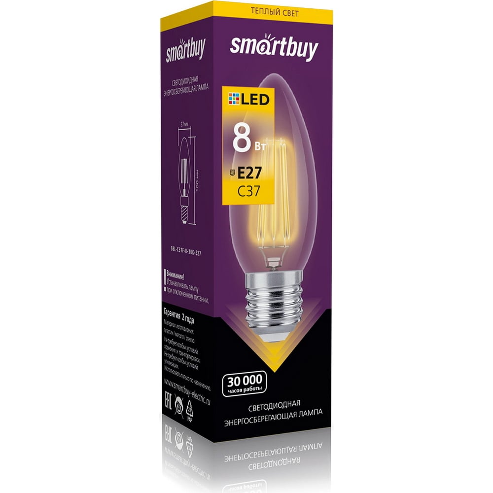 Светодиодная LED лампа Smartbuy FIL C37-8W00/E27 SBL-C37F-8-30K-E27