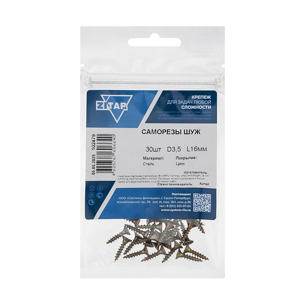 Саморез ШУж 3,5х16 потайная головка 30 шт, пакет Zitar 102479