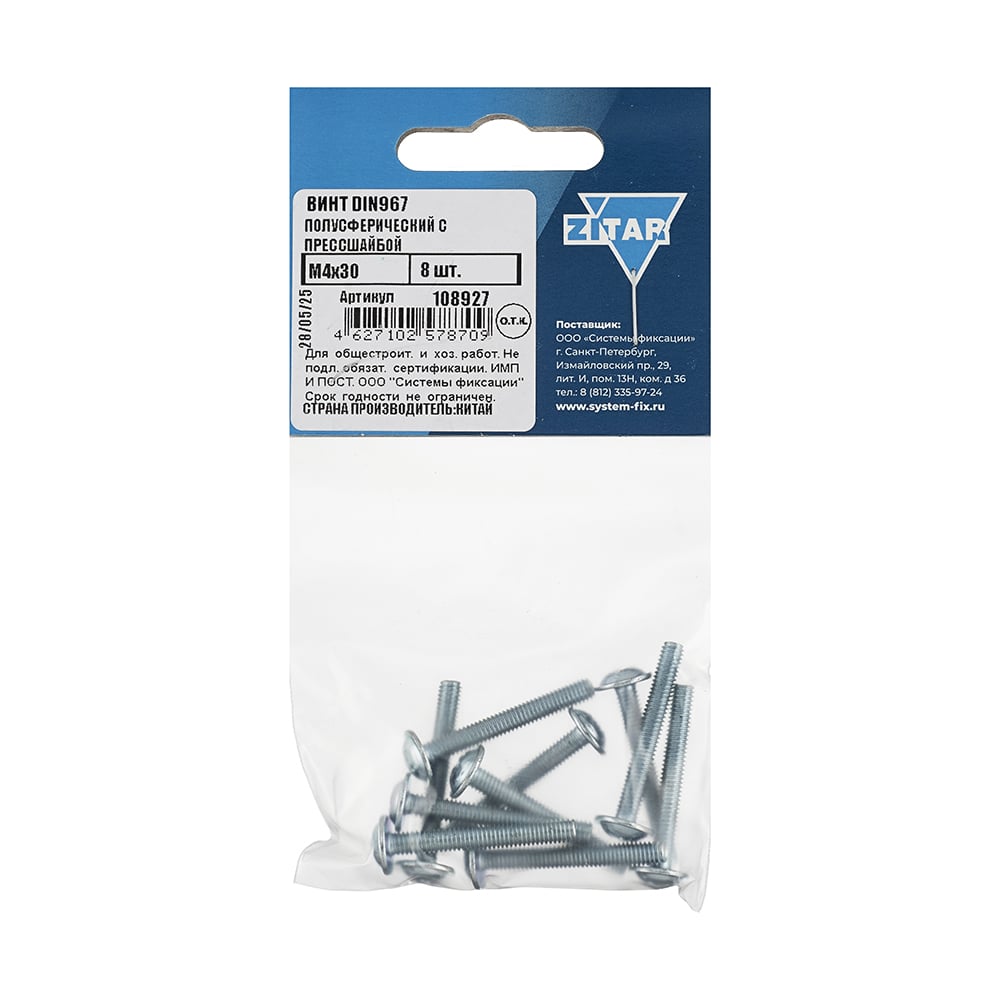 Винт для крепления ручки оцинкованный М4x30 мм, 8 шт, пакет Zitar 108927