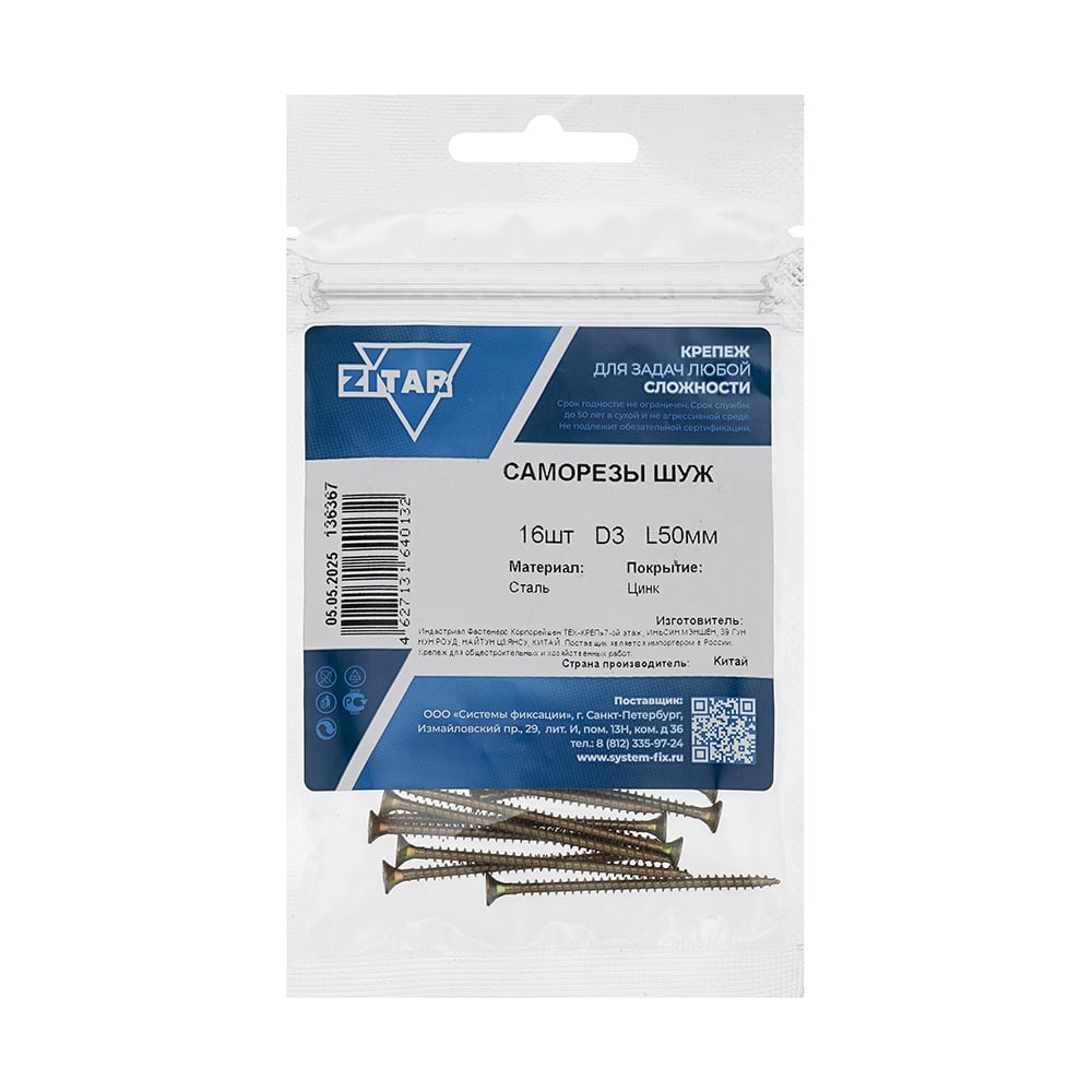 Саморез ШУж с потайной головкой 3,0x50 мм, 16 шт., пакет Zitar 136367