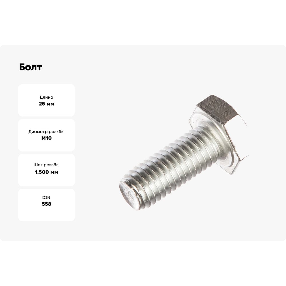 Шаг резьбы 1.5 мм Длина 25 мм Комплектация болт Вид головки шестигранная Тип резьбы полная DIN 558 Тип фасовки шт. Класс прочности 5.8 Диаметр резьбы М10 Направление резьбы правая Материал сталь Покрытие цинк ISO 4018 ГОСТ 15589-70 Фасовка 2 кг Фасовка 90 шт