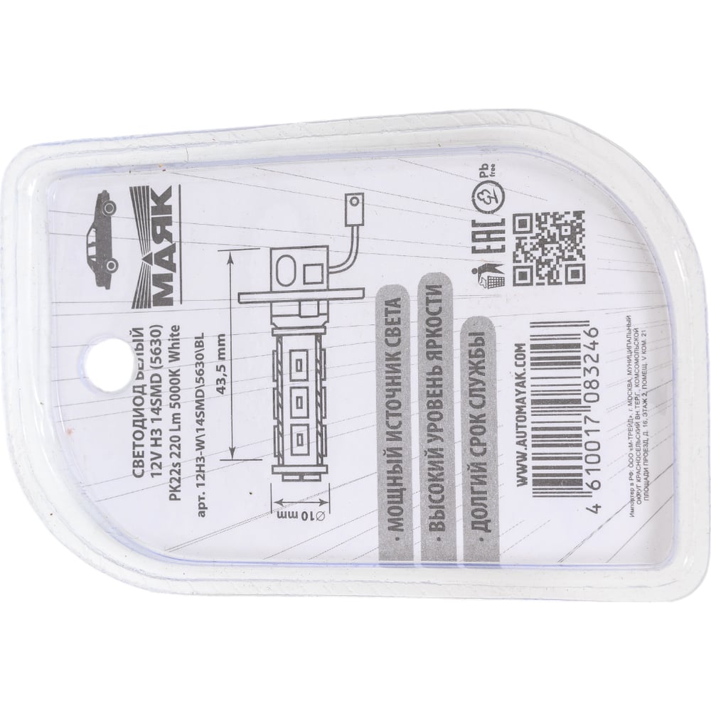 Светодиод МАЯК WHITE 12V, Н3, 14SMD, 5630, PK22s, блистер 12H3-W\14SMD\5630\BL