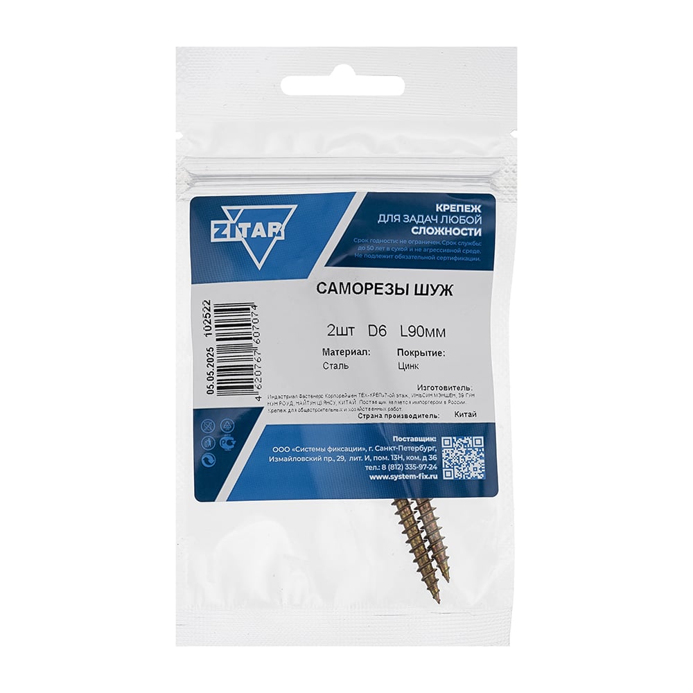 Саморез ШУж с потайной головкой 6,0x90 мм, 2 шт в пакете Zitar 102522