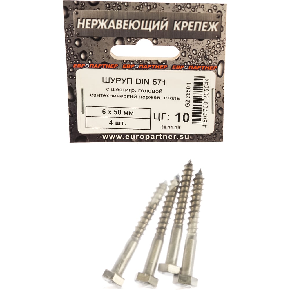 Сантехнический шуруп ЕВРОПАРТНЕР DIN 571 с шестигр.гол. 6х50 нержав. сталь 4 шт. G2 2650 1