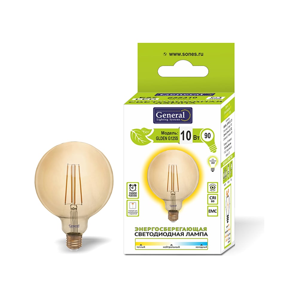 Светодиодная лампа General Lighting Systems Филамент прозрачный золотой E27 10Вт 1025Лм 2700К Теплый белый свет Шар GLDEN-G125S-10-230-E27-270 655310