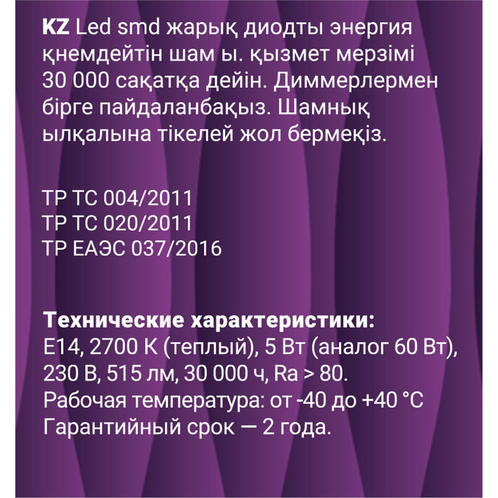 | Цветность | теплый белый (менее 3300 К) |