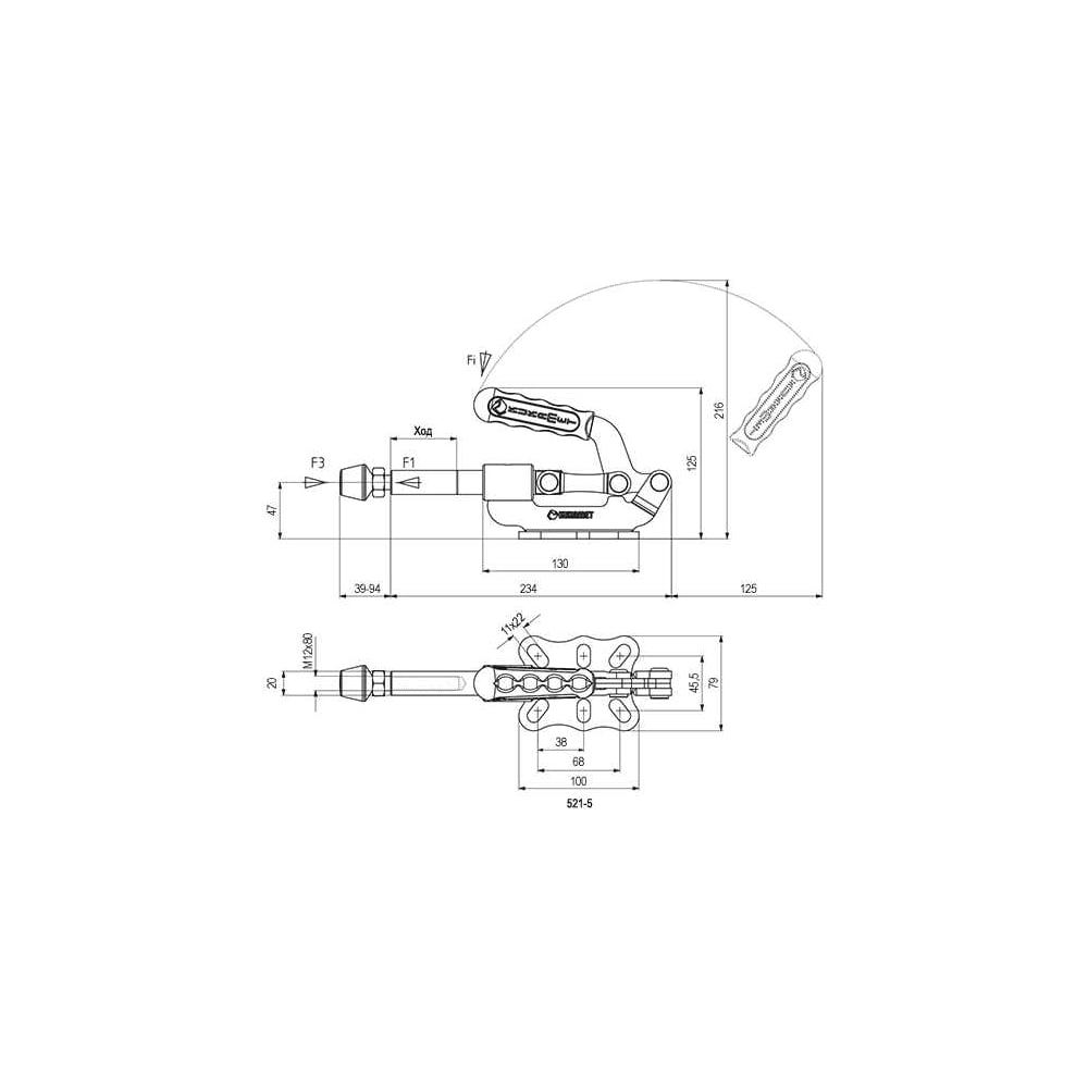 Зажим плунжерный с горизонтальным кронштейном KUKAMET, усилие 765 кг 521-5-Q20