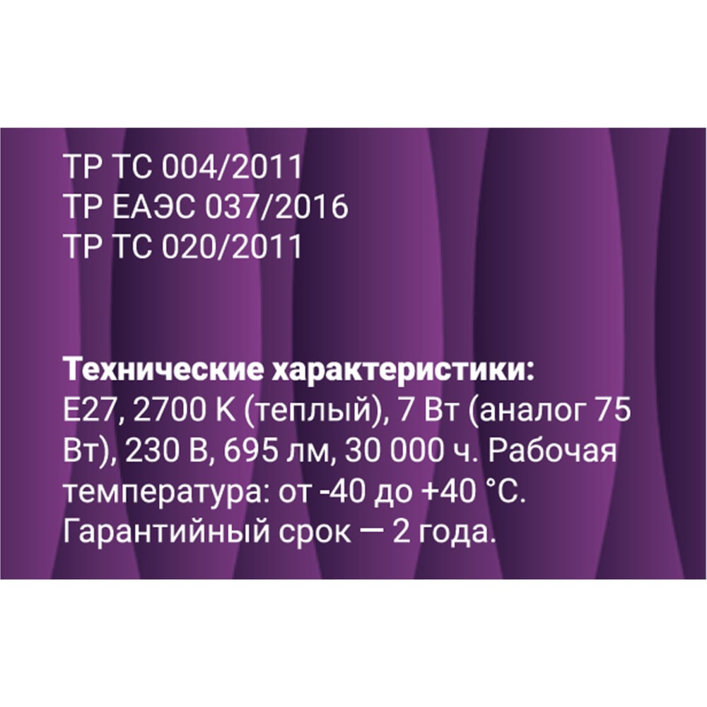 | Цветность | теплый белый (менее 3300 К) |