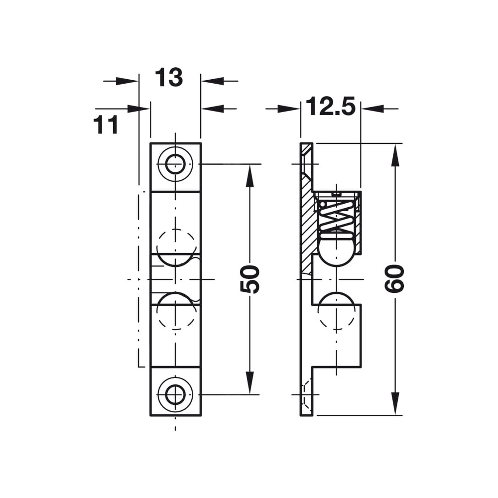 Двойная шариковая защелка Hafele латунь никелированная, 60 мм 244.20.616